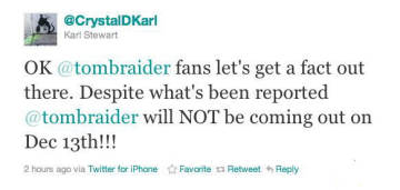 昨天,Tomb Raider/Crystal Dynamics的全球品牌总监Karl Stewart在其Twitter上辟谣说,《古墓丽影9》绝对不会在12月13日发售!!!