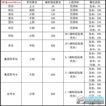 编制等级提升到以下条件后,可获得编制称号并获得作战单位属性,部分高级称号有人数限制,编制经验高者获得