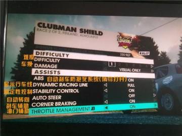 尘埃3 行车引导线关闭方法 可自定义设置 来源: 飞翔小编 2011/5/26 17:41:48 浏览量:1305 尘埃3玩家们可能很多人都想知道怎么关闭行车引导线,下面我就简单的教教大家,很方便的,你只要载入场景后 选第三项叫DIFFICULTY AND ASSISTS的选项 分别有3种模式,CASUAL,INTERMEDIATE和ADVANCER,分别是休闲模式,中等模式,高手模式。下面还有一个选项,里面可以设置具体辅助选项,设置完出来 难度显示为custom(意为用户自定) 具体设置如图 最后祝大家游戏愉快!