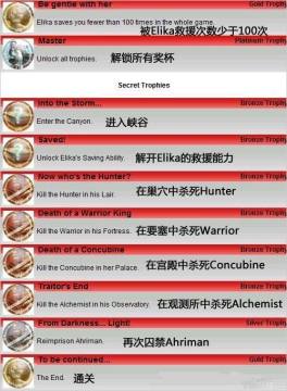 《波斯王子4》中文附注全奖杯列表 来源: 飞翔小编 2011/5/31 10:53:23 浏览量:278 波斯王子4需要通过收集奖杯来证明玩家的通关难度,一些苦手玩家还在苦苦挣扎的时候,高级玩家却已经傲然通关了。 下面展示一些奖杯的中文列表。
