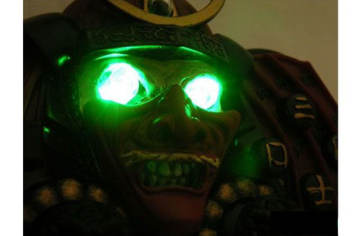 不过,小编在这里给大家推荐一款纯属自虐的手柄,不仅外观惊人,而且使用起来想必会非常难受。手柄的外形给人印象最深的是其日本武士装扮,采用USB连接PC,而且面具上眼睛部位居然还会发光,还是绿光,阴森森的感觉,千万不要在小孩子面前拿出来。