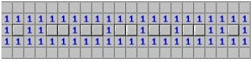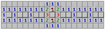 通过逐步扫描每一个方块会发现:首先最左边的和最右边的两个格子都一定是地雷,从左数第二个空格子和从右数第二个空格子也都是地雷,由于数字1的关系,从左数第3个格子和从右数第3个格子都不是地雷,翻开一定是数字1……这样一直下去,最后你会发现最中间的两个空格子,不管有没有地雷,都和周围格子上的数字不符。也就是说这样的雷区有bug,是无解的。