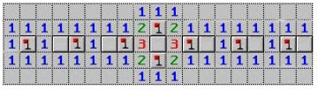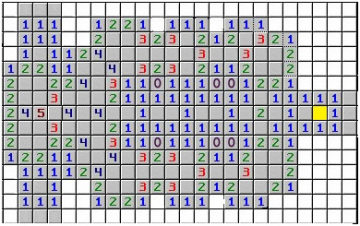 在简单的雷区中小试牛刀后,带着发现的规律,让我们进行一次实战演习。下图是高级扫雷游戏中的一个典型的雷区: