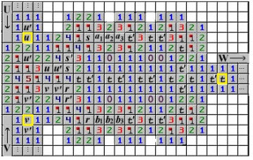 雷区内靠近边界、可以直接确定是地雷的位置都插上了标示旗,剩下的位置标上了不同的字母。把一个有地雷格子看作1,没有地雷的看作0。最左面的格子(u、v)作为输入,最右面的格子(t)作为输出。按照扫雷游戏的规则,经过一步步推算,它们之间的关系就是: