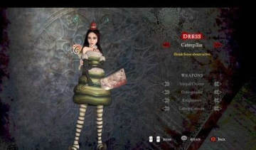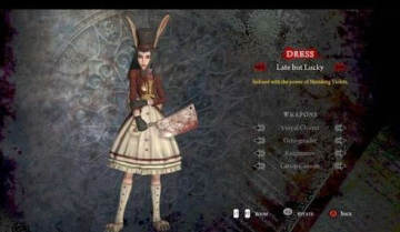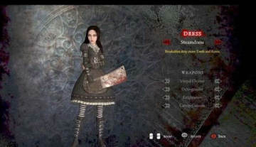 爱丽丝每通关一个关卡,衣服都会增加一件,然而DLC中提供的某些衣服简直就是bug,跟开G几乎无区别了。下列图示的爱丽丝各套衣服都有详细的特效说明,还有短发爱丽丝。