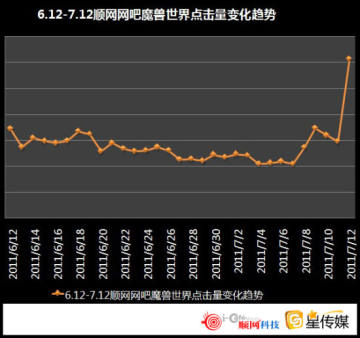 网吧媒体平台顺网星传媒向新浪科技提供的数据显示,6月12日~7月12日的一个月中,魔兽世界程序在近十万网吧平台的点击量,从7月7日就开始出现猛增,截至7月12日点击量已上翻三倍。百度风云榜中魔兽世界用户关注度的趋势与之基本一样。