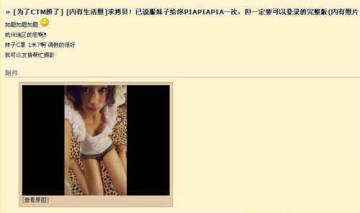 近日,有玩家发现在某著名魔兽论坛上一篇名为《[为了CTM拼了][内有生活照]求拷贝!已说服妹子给你PIAPIAPIA一次,但一定要可以登录的完整版(内有照片)》的帖子,全部内容为:“如题如题如题,杭州地区的密啊!妹子C罩,1米7啊,调教的很好,我可以友情帮忙摄影。”并在帖子最后附上了一名女孩的生活照片。