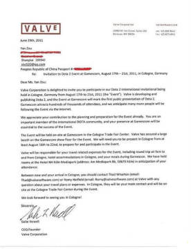 一位名叫Yan Zou的玩家最近上传了一张由Gabe Newell亲笔签名的邀请信的图片。早先的时候,我们曾得知《DotA 2》或许会出现在今年8月的Gamescom上,现在看来应该是确有其事了,很多专业玩家和知名战队都受到了邀请去参加展会。这位玩家所上传的这张图片就是最有力的证据。