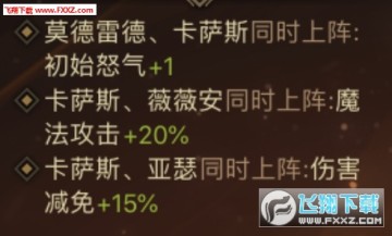 武将缘分组合方面,卡萨斯的第一选择肯定是莫德雷德,搭配上卡萨斯本身的天赋,初始怒气加2的优势在开场就能给予敌人沉重的打击,同时搭配上薇薇安也能最大限度的提高魔法伤害。