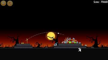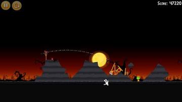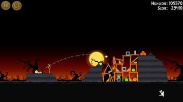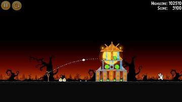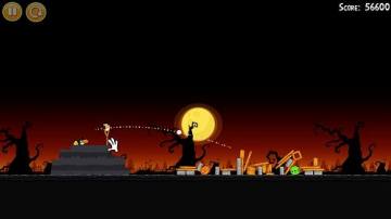 1-27:头两只鸟都如图方式拆掉左下角砖块和反弹摧毁上面的建筑结构,然后加速鸟穿过底下的木框,上面的建筑会倒下砸烂底下的两只猪,并且砸烂一定数量的南瓜,搞定!