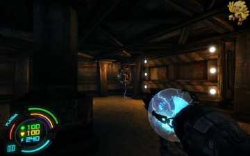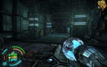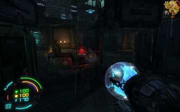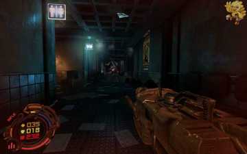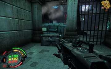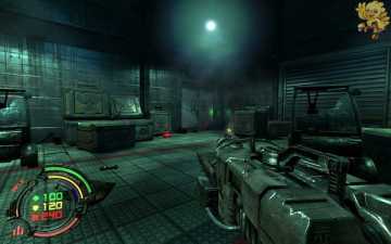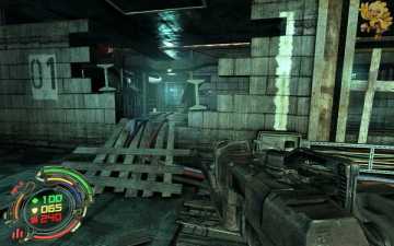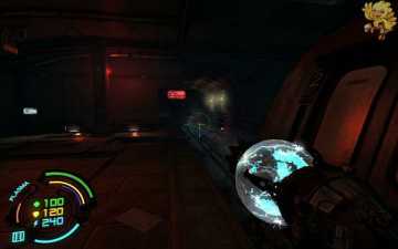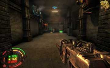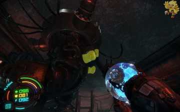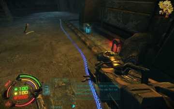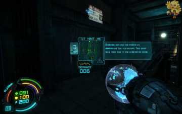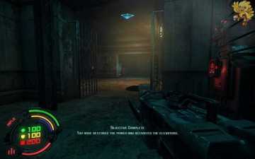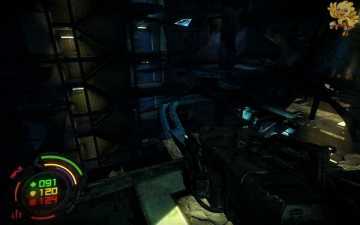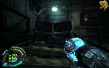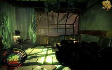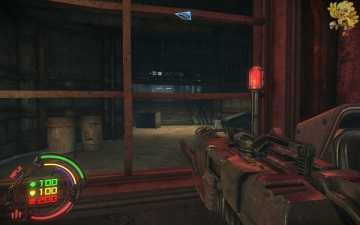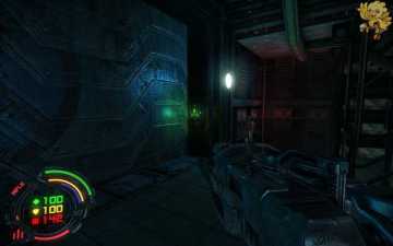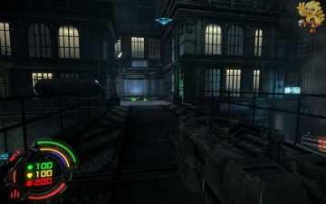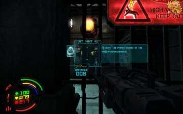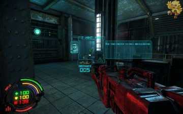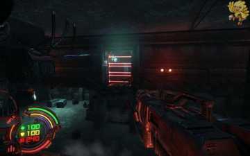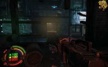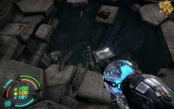 跳过去后进入窗口进旁边门,继续清理人形机器怪,这里也要打开两个电源开关,两边的房间里各一个,两个都打开后会像地震一样,抖动一会,然后我们从旁边的房间里那裂口处跳出去,沿着路往左走。