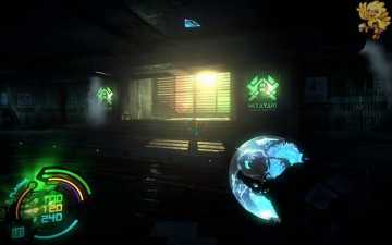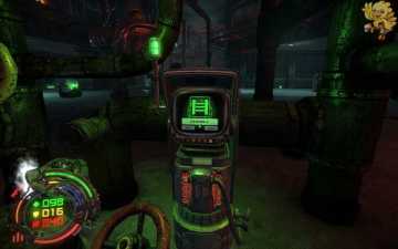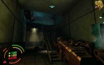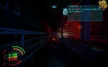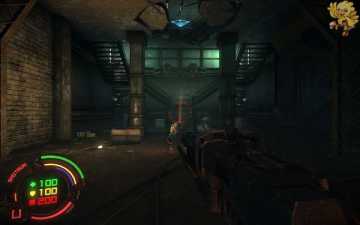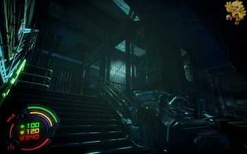 打开旁边的门从左边的楼梯间上去,上去后到达了刚才大厅的第三楼,从桥上过去,清理机器人,过去进入一个阴暗的房间,从前面的楼梯间下去。