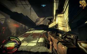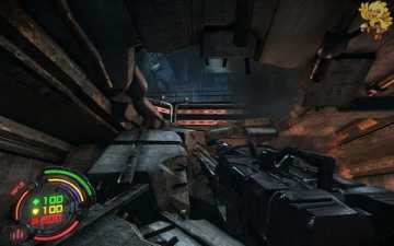 打爆上面的东西..进去打开发动机,然后出来到刚才有红色条封闭的门那,右边的控制器,打开门,走过去,往左走,往左走不要从第一边的梯子上去,走最里面的梯子上去.上去会看见机器人,打掉,从右边梯子上去,看见门是封闭着的,往左上角看。