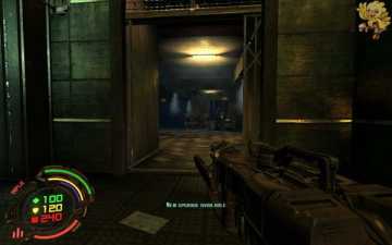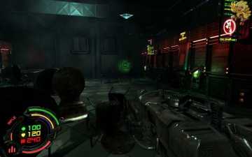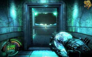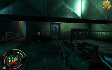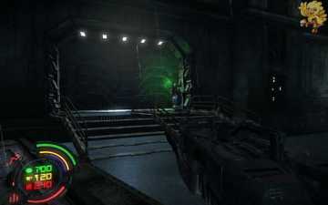 打开后我们还是往前面走,走过桥进门就会看见前面有个绿色电梯按钮,按下去上面的电梯会降下来,然后进去,此时会有很多小怪围攻过来,出电梯准备好作战吧。