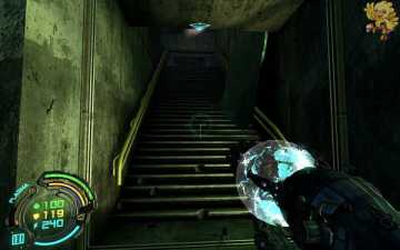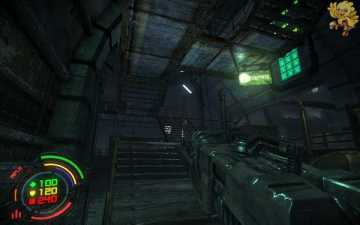 出去后往右走,进一个房间跳下去,会有很多人形机器人围攻过来,消灭完,打开那旁边的门,从楼梯间一直盘旋直下.。