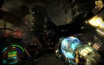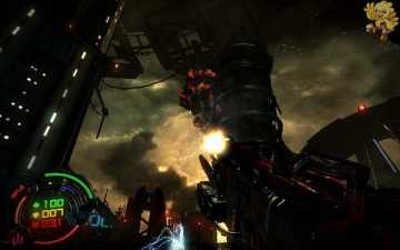出来直走从前面的楼梯上去,上去过一个通道在那清理小机器人,小心被油管的火喷到,退出来打,清理完后出去,看到很大一架飞船,飞船过来的时候打上面的油桶,飞船会被击落获得一个成就,然后我们在前面打开一道门。