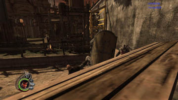 清理广场的所有小兵,然后把铁门打开。一路往前走,在同伴的协助爬上哪个围栏断开的台子上面去