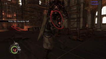 注意我第一张图片表示位置,箭头方向和BOSS后面有一小圆厅,把BOSS带过去,然后朝着他腿猛砍,