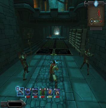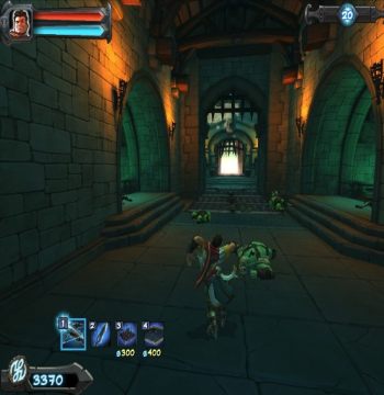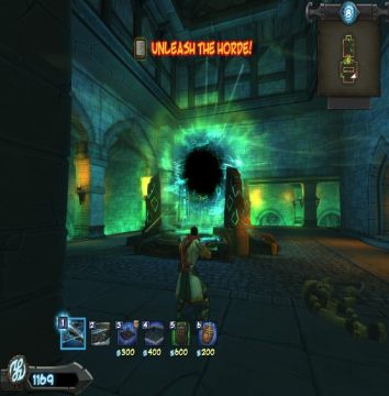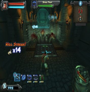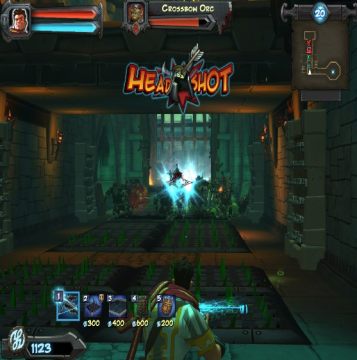 《兽人必须死》走的是3D塔防路线,游戏舞台是24关古堡要塞内的封闭场景,战斗爆发后大群兽人会沿着可通行路径发动冲锋,它们的目标是地图尽头的魔法裂隙,那也是玩家守护的对象,有如《植物大战僵尸》里的主角小屋。当兽人扑入魔法裂隙后会减少小雷达上方的裂隙生命值,降低为零则宣告失败。本作中玩家不再通过高高在上的上帝视角操控游戏,而是扮演一位能直接投入战斗的大帅哥,每场战斗前主角可以从容不迫地观察防区地形,地面上流动的闪光线条清楚标出了兽人进攻的路线,仔细考虑如何设置陷阱机关,准备完毕后喊声Action放出敌人受死,战斗中随时能用杀敌赚来的钱现场施工补铺陷阱,总体来看这游戏打起来比《植物大战僵尸》要轻松得多。