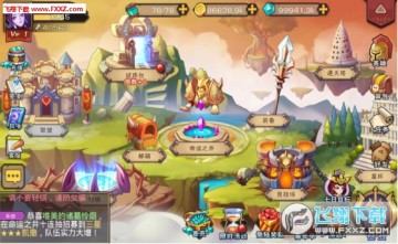 游戏玩法从左至右依次是【排行榜】、【联盟】、【邮箱】、【地下城】、【邮箱】、【试炼台】,【命运之井】、【装备】、【竞技场】、【通天塔】、【星杯】、【商店】和【时空远征】。