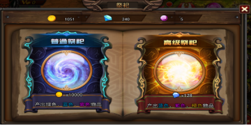祭祀分为普通祭祀和高级祭祀,普通祭祀一次花费10000金币,十连抽9000金币;高级祭祀一次花费128钻石,十连抽1150钻石。