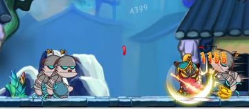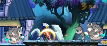 等上了台阶,一个武力强化,让他们全跳上去。然后一个冲刺冲到台阶下,这样会有一两只落单的跳下来。这样就是好机会了,攻击三次(前前攻顺序),风火杀扫掉残留的血,杀了那两只蓝怪,由于刚下台阶,不会反抗。然后回头在他们落下来之前再次冲刺到左边。因为我们都知道当人物到了一个角落,那些在另一个角落边的怪会回头转一圈。所以就趁着他们回头的空,跳起来风火杀,把他们杀掉,或者至少耗掉大半血。