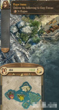 现在你已经可以建造第二栏的建筑了,建造一个大麻园和纺织小屋,积攒5个纺织物品运送到左边的港口去,如果工具不够的话就去,右边的岛去买,此时也会出现招募十字军骑士的任务,移动到你的市场那里,会出现很多蓝色的士兵切换近景点击它们就行了,招募10个,带上5个纺织物和10个招募士兵一起送到左边的海岛港口,完成了两个任务