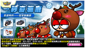 就在大家商量主角的时候,宝宝偷偷的换上了这套衣服。只见宝宝身着驯鹿服,样子十分可爱,而宝宝一直都是个性的代表,而今穿上个性的服装,果然有了最好的效果!于是,大家一致同意,由宝宝来担任驯鹿服的模特,并准备了一些惊喜活动送给喜欢宝宝的玩家——12月1日至12月7日,持有宝宝驯鹿装的玩家,再购买宝宝(10天)的话,可以获得20%的优惠哦!