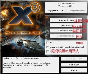 X3:阿尔比恩序曲游戏菜单中文翻译 来源: 飞翔小编 2011/12/17 8:55:06 浏览量:649 X3:阿尔比恩序曲是一款很好玩的单机,可是游戏全英文的上手不是那么容易,所以本站为大家把游戏界面翻译了一下给大家作为参考。