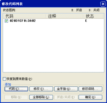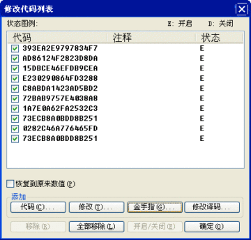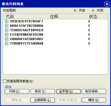 注意每次修改时都要加上开启码并删去之前的金手指