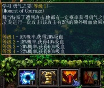 看到这个技能我第一反应就是,这不是斧王的转撒。确实,这个技能和斧王的转非常像,都是挨打才有输出的。不过不同点在于斧王的转前期输出高,而勇气之霎的成长更高,后期更强同时附有吸血效果,可以用他来出门打野。不过吸血并不是重点(毕竟挨小兵打吸血很划算,挨英雄攻击吸血,就那么两下根本吸不过来),关键在于会多攻击一下,在后期有攻击的情况下输出会非常高,并且如果出一些概率性触发的装备(比如碎颅锤,雷神,散花),多攻击一下就多一下出技能的机会。不过前期点一级就够了,毕竟前期挨打比吸血疼的多。
