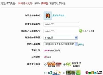 好了开始刷了首先,你要准备一张没有用过的神州行冲值卡,随便多少钱都可以。推荐用50.100的。这样刷更快.当然用少的也是可以的。本人用的是一张100元的充值卡。登陆充值页面充值: http://pay.duowan.com/或登陆游戏里面的冲值页面。点击弹弹堂,然后选择神州行支付(admin是内部管理员系数中心数据代码,通俗点是可以理解为商城管理员代码)我刷给你们看下,这是刚刚注册的号来的,大家要认真细心的看好啦(如下图)