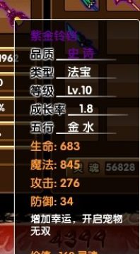 紫金铃铛: 紫金开山斧+紫金轻甲+紫金镔铁棍;技能: 摇铃:增加幸运,开启宠物无双。