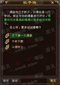 其中天下第一大酒豪是连续喝10杯以上(含10杯)酒并且不醉就会有这样的称号奖励。