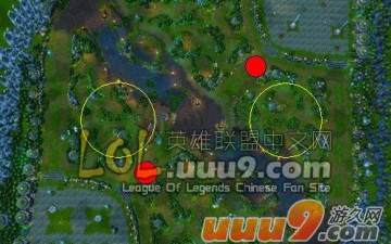 E(怒!),然后从四小鬼开始(点掉大的),三小狼后稍等5~10秒再去蓝BUF。更优化的思路是,能从三小狼跑到中路二塔处等待这5~10秒,如此可很好的避开对面针对蓝BUF的洞察。(黄圈为敌方洞察探查的地方,红色区域为木木躲洞察,等点金CD的地方)