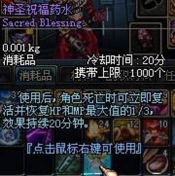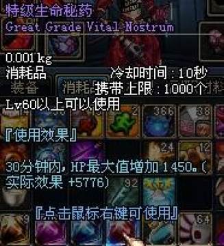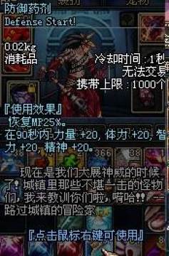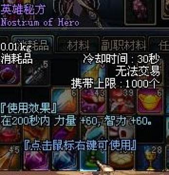 此物品几乎可以说是霸体药水的升级版本,相对缩短了持续时间,增加了药效,可以免疫任何攻击,30M的冷却时间,导致他只能用一次,不过在回城以后冷却可以重置,建议在比较危险的情况下使用。还是由于材料的难以寻找导致他的价格与精神刺激药水相仿………