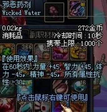 这种药水只有在天帷巨兽中才能获得,听说这是当地GBL教成员的邪念所聚集形成的药水,可以暂时性使人疯狂,切记,此物品冷却不是独立的