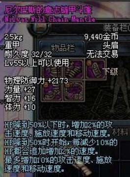 尼尔巴斯的意志斗篷,特殊属性为:增加2%的攻速,移速,释放。HP量在50%以下时,提升2%的攻击速度,移动速度,释放速度。