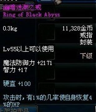 也算是PK神器了。部位是戒指。硬直+100,攻击的同时1%的几率回复4%的HP血量。无内置CD,瞬回,可以连续触发。