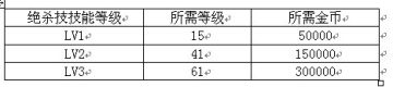 绝杀技分为三个等级,每次金币技能的等级都是在赛利亚处通过任务来提升,每次学习绝杀技时都需要付出一定的金币。三个等级的绝杀技需要积累的能量点数逐级上升。