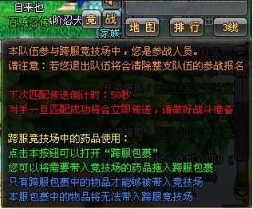 可携带物品:在跨服战中,玩家只能够使用事先存入跨服包裹内的药品(跨服竞技场中不能使用原区服中的包裹功能,要使用药物,玩家必须事先将药品存入跨服包裹中)。该跨服包裹和跨服竞技场的跨服包裹共享。