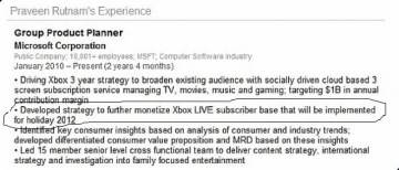 玩过微软的家用机XBOX360的玩家知道如果要在XBOX LIVE上购买游戏必须支付MSP点数,但由于最近利用被盗信用卡购买MSP点数的情况日益泛滥,对游戏收益照成了很坏的影响,微软正准备采取新的游戏下载支付方式。在近期微软集团客户产品规划师Praveen Rutnam的招聘资料里,小编发现了一点令人感兴趣的小细节。它显示此人在微软任职期间所作的一些工作或许和“微软币”改革有关。在这份档案中,Praveen Rutnam的工作经历一栏中写道“为Xbox LIVE的货币化改革做出了战略规划,此改革将会在2012年末中实行。”