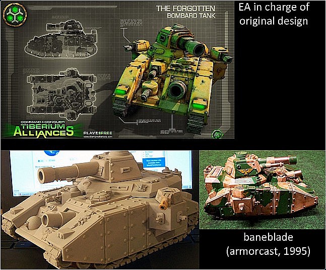 在国内一些网络游戏在设计上相互抄袭,同行之间已经形成了默认的态度,而在知识产权及其严格的国外,一些设计图上的借鉴或者抄袭现象将会直接影响到公司的企业形象。对于最近网络上出现的EA公司盗用Games Workshop公司的《战锤40K》中的设定,将其用在《命令与征服:泰伯利亚联盟》坦克设计上这一指责,EA于今日做出了正式回应。