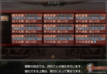 军略的技法,可以实行兵科强化。强化的上限依势力的不同而有区别。曹魏、东吴、蜀汉三方势力可能会有不同的技法上限,各具特色。