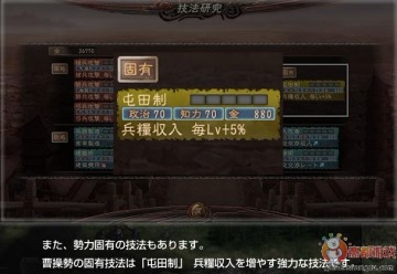 另外,每个势力都有它的独有技法。曹操的技法是『屯田制』,是一种能增加兵粮的强力技法。