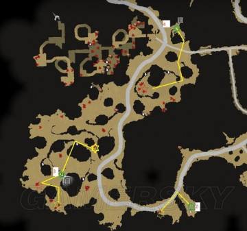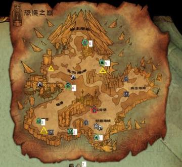 世界地图上1~6所标记的,是刷怪时会用到的降落点。7实际上是传送到1以后进洞,一路狂奔最后到达的位置,为啥要去这里,后面说明。三个黄色的三角,表示的是某个不负责任的苦力,在偷盗完贼船之后,遇见小怪兽丢下物品独自逃跑时,包裹掉落的位置,这个时候,木有办法,只能自己给他擦PG了。