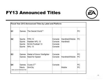 对于即将开展的E3,各大游戏厂商近期都摩拳擦掌,对外公布了旗下游戏的最新情况,EA公司也不例外。外媒报道了EA公司发布了2013年财年产品阵容以及最新的财报内容,从这份图表里我们可以看见在Q3,也就是第三季度里极品飞车的新作将与玩家见面的消息。看来更多详细信息只能等6月E3电玩展上EA的发布会了。