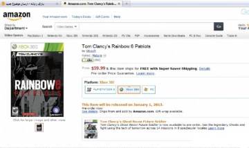 如图所示这是亚马逊预购游戏的画面,图上显示《彩虹6号:爱国者》的发售日是1月1号,也就是元旦期间登入PC、PS3和XBOX360平台,售价59.99美元,折合人民币约为360。