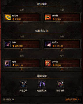 DH 的技能不管如何搭配, “烟幕”这神技和" 箭术专精“ 被动是必定要选的。 “烟幕” 是DH 炼狱难度能够生存下来的唯一手段,我曾经试过堆血+“暗影之力”靠吸血顶着杀, 结果完全不给力…… 而" 箭术专精“ 是技能搭配的根本思想, 也强化了 “弓” “弩” “手弩” 三种武器的发展方向和思想。其他技能,至少要有一个恢复戒律的技能或者被动, 至少要有一个产生憎恨的左键技能, 还有一个使用憎恨的输出技能。