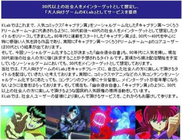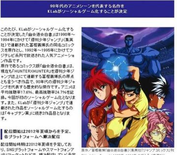 日本KLab公司宣布著名游戏动漫作品《幽游白书》将被改编成网页游戏,于夏季开始发售。《幽游白书》是由漫画家富坚义博于1990年开始在少年跳跃周刊连载的经典作品,于1992年被拍成动画。
